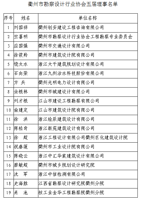 衢州市勘察设计行业协会第五届会员大会于2016年6月15日在衢州举行。本次会议应到会员41名,实到36名,符合本协会《章程》规定。大会形成如下决议: